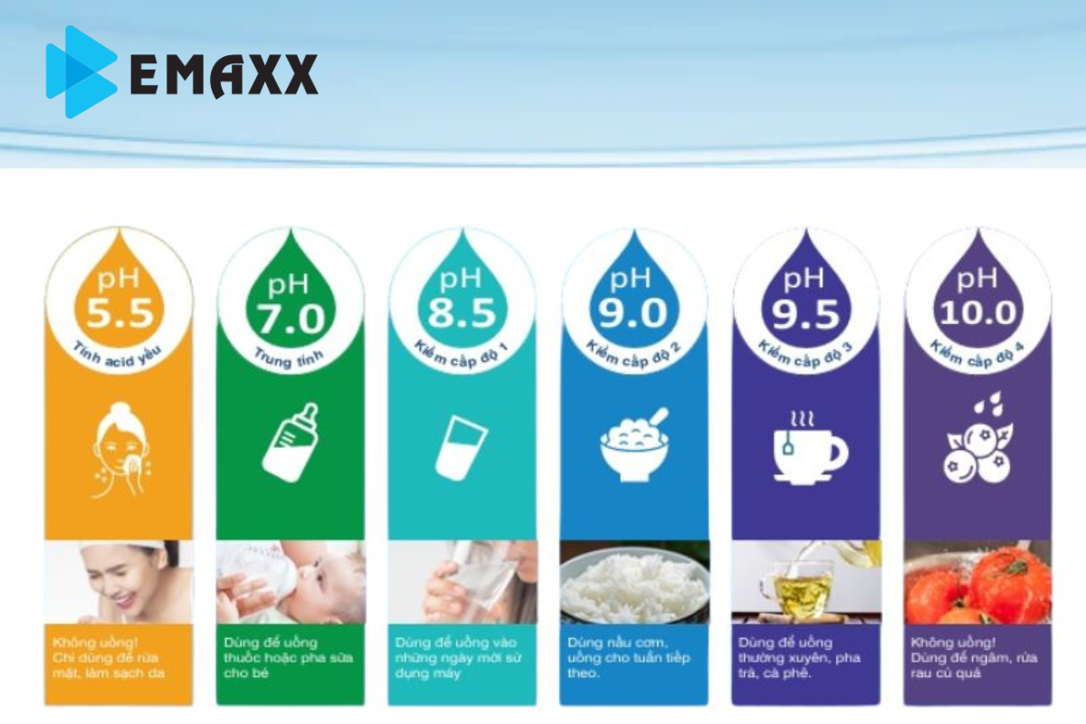 Nước ion kiềm có độ pH từ 8.5 đến 9.5 là lý tưởng để tiêu thụ hàng ngày. Đây là mức độ kiềm vừa phải, có khả năng cân bằng axit trong cơ thể. Tuy nhiên, khi nước có độ pH trên 10, nó không còn phù hợp để nạp vào cơ thể nữa.
